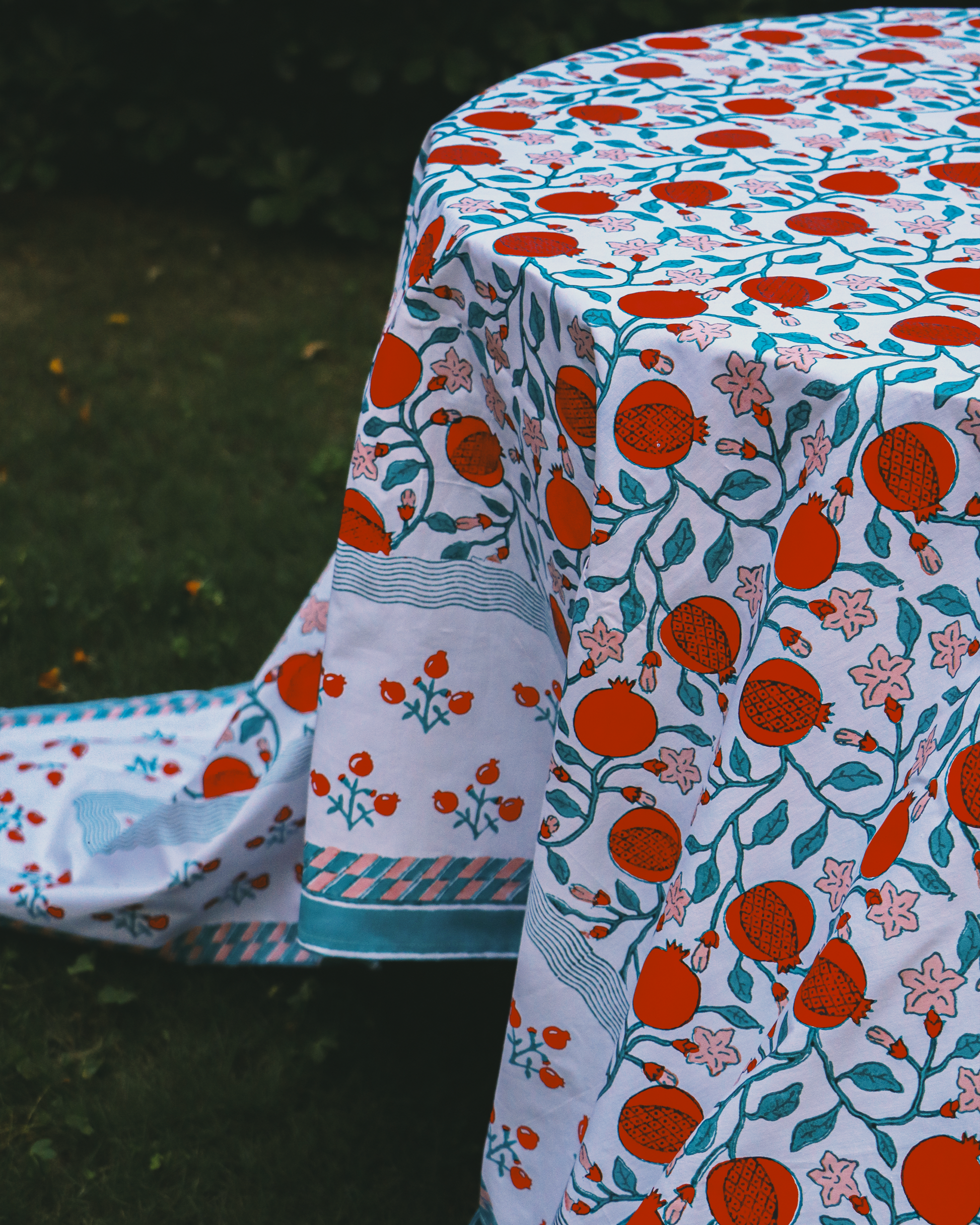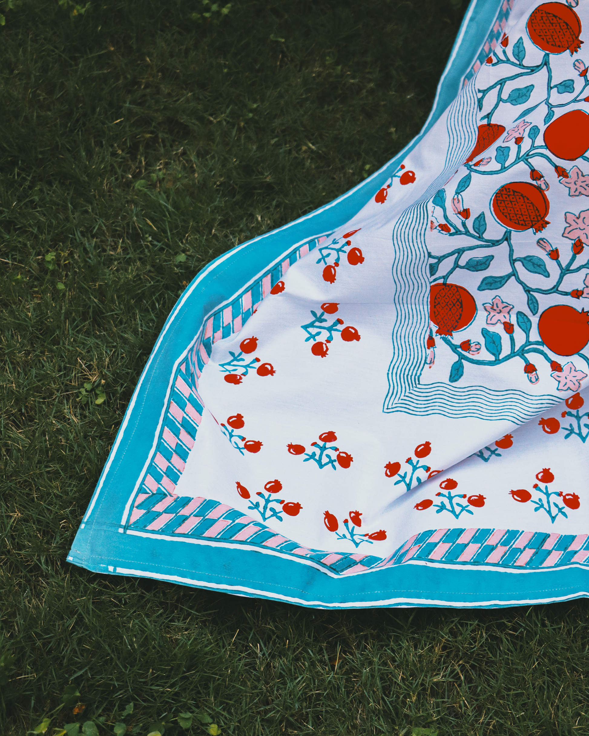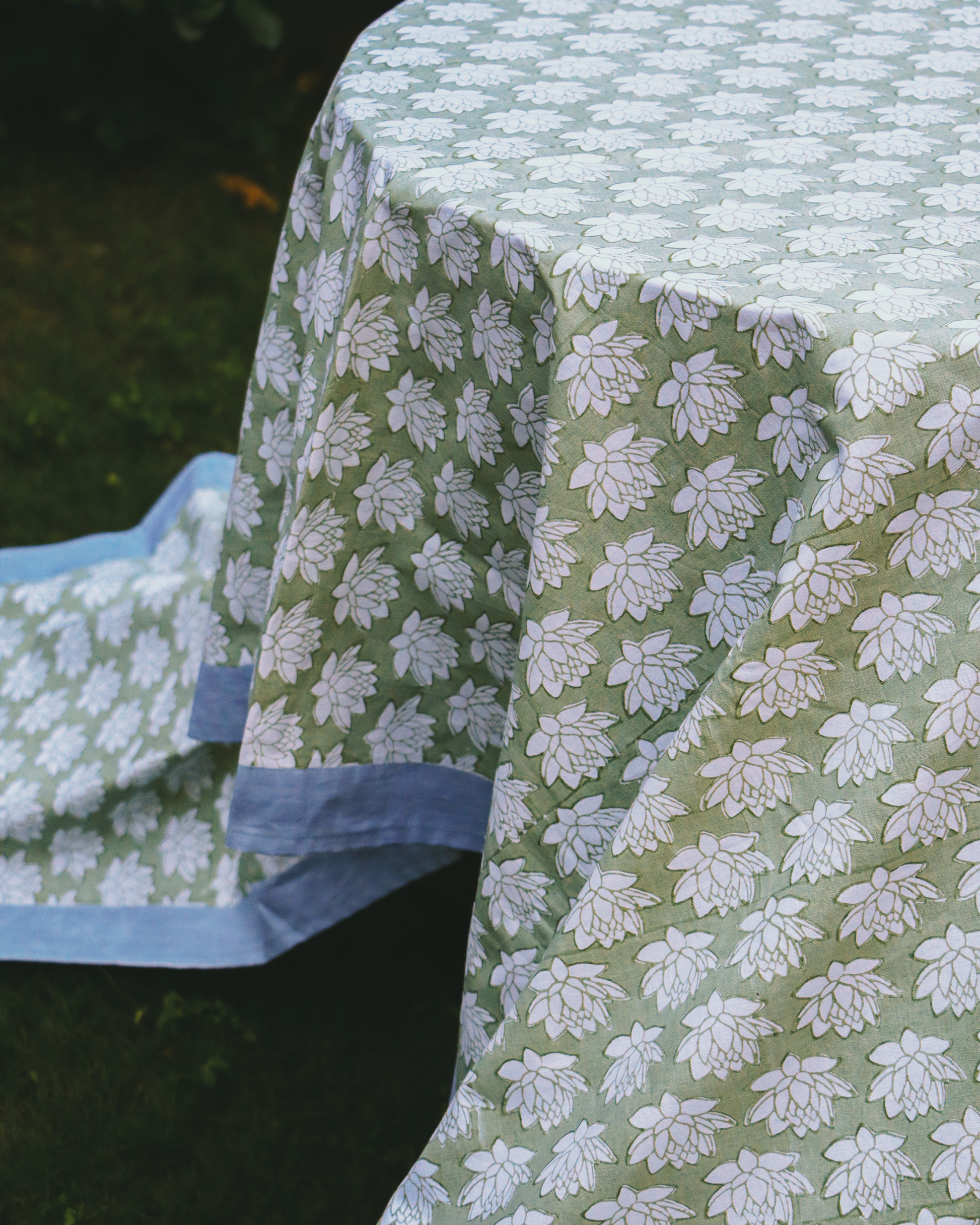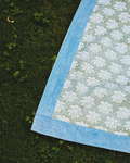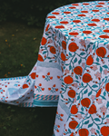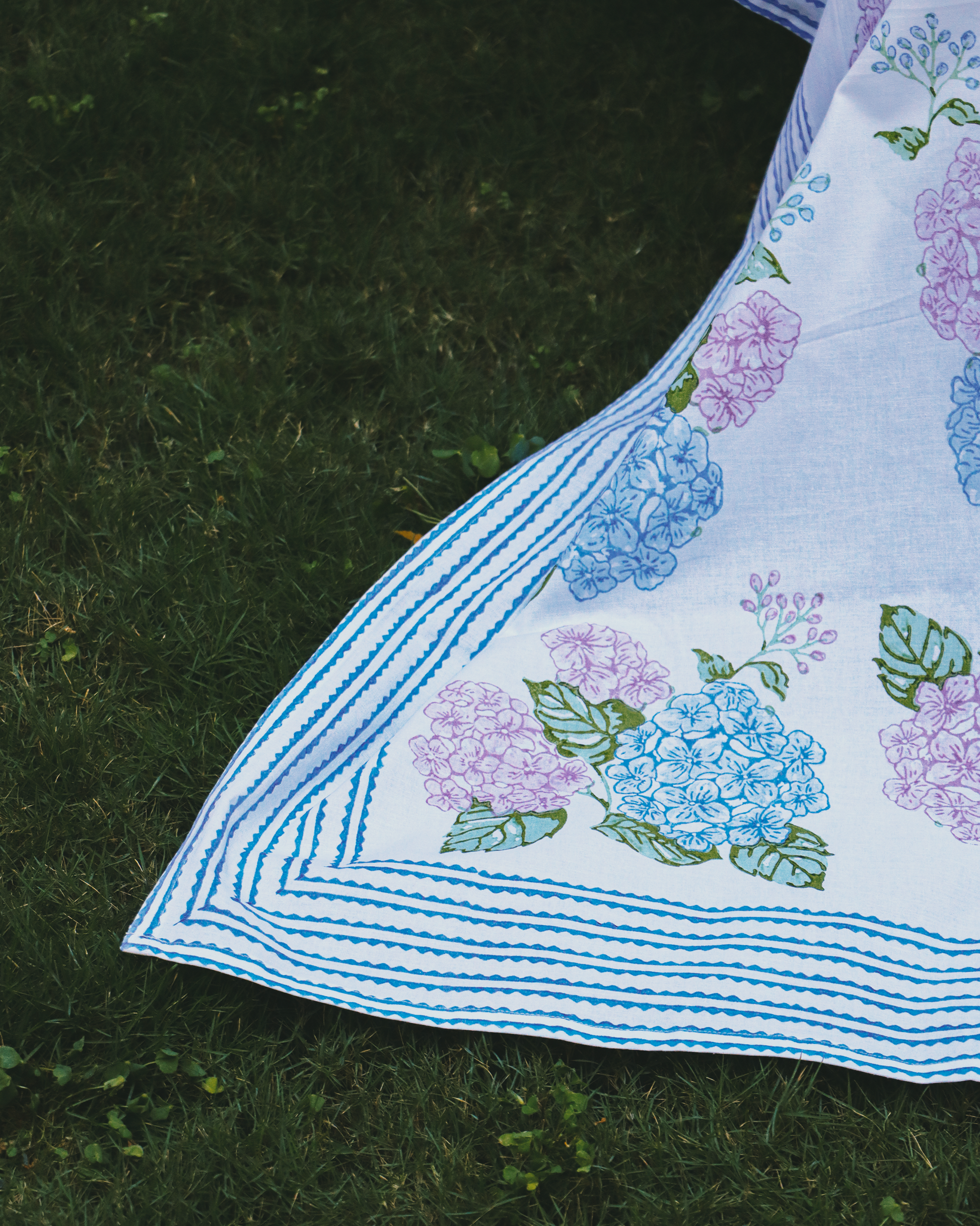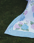 Bring timeless charm to your dining or outdoor setup with this floral printed cotton table runner. Crafted from soft, breathable fabric, these piece features delicate hydrangea motifs in pastel hues of lavender, blue, and green—perfect for adding a touch of freshness and elegance to any space. The striped border adds a refined detail, making it ideal for both casual brunches and formal gatherings. Whether draped over a round garden table or a classic dining surface, this hand-block printed table runner is the perfect accent to elevate your table decor with artisanal beauty.