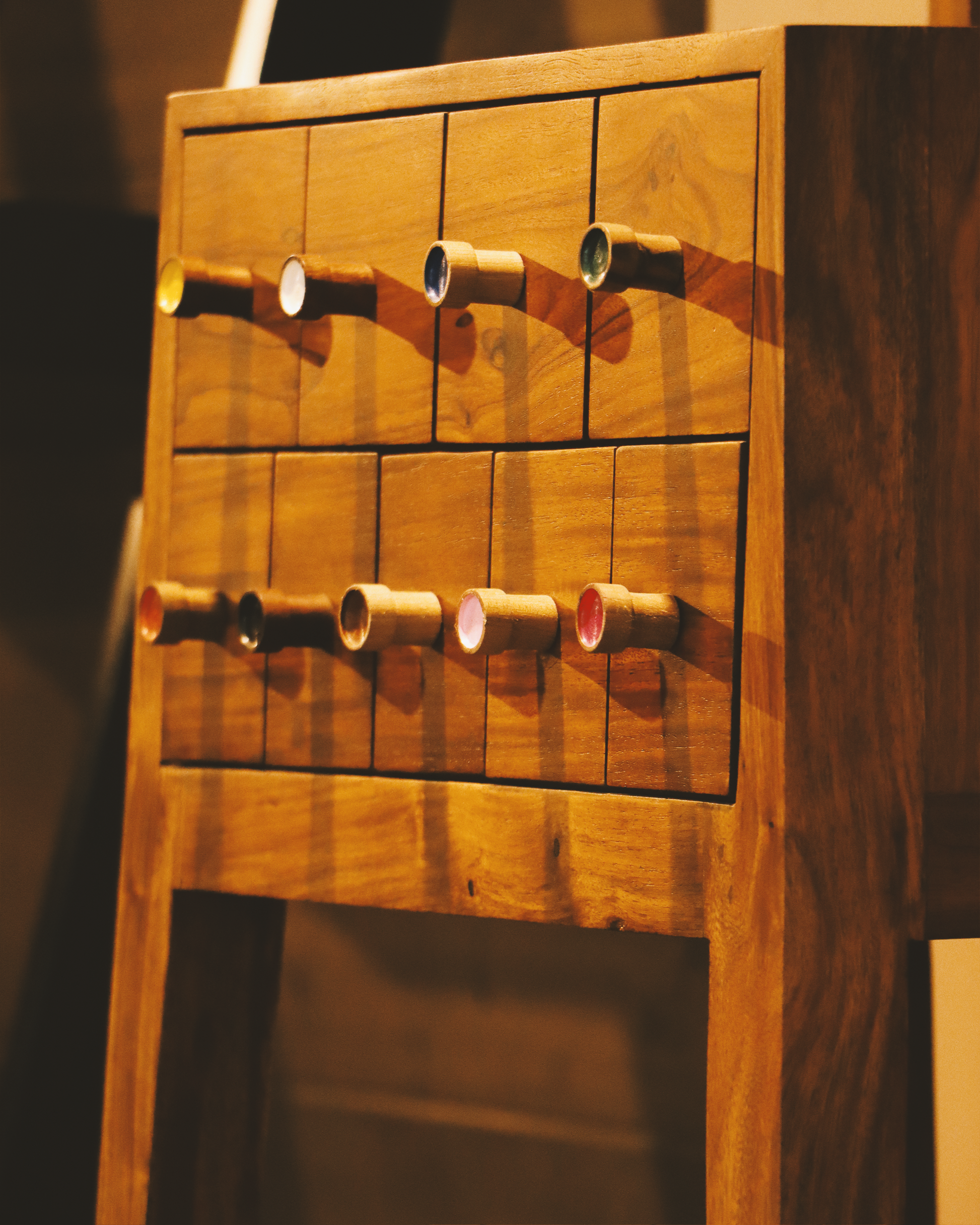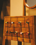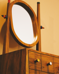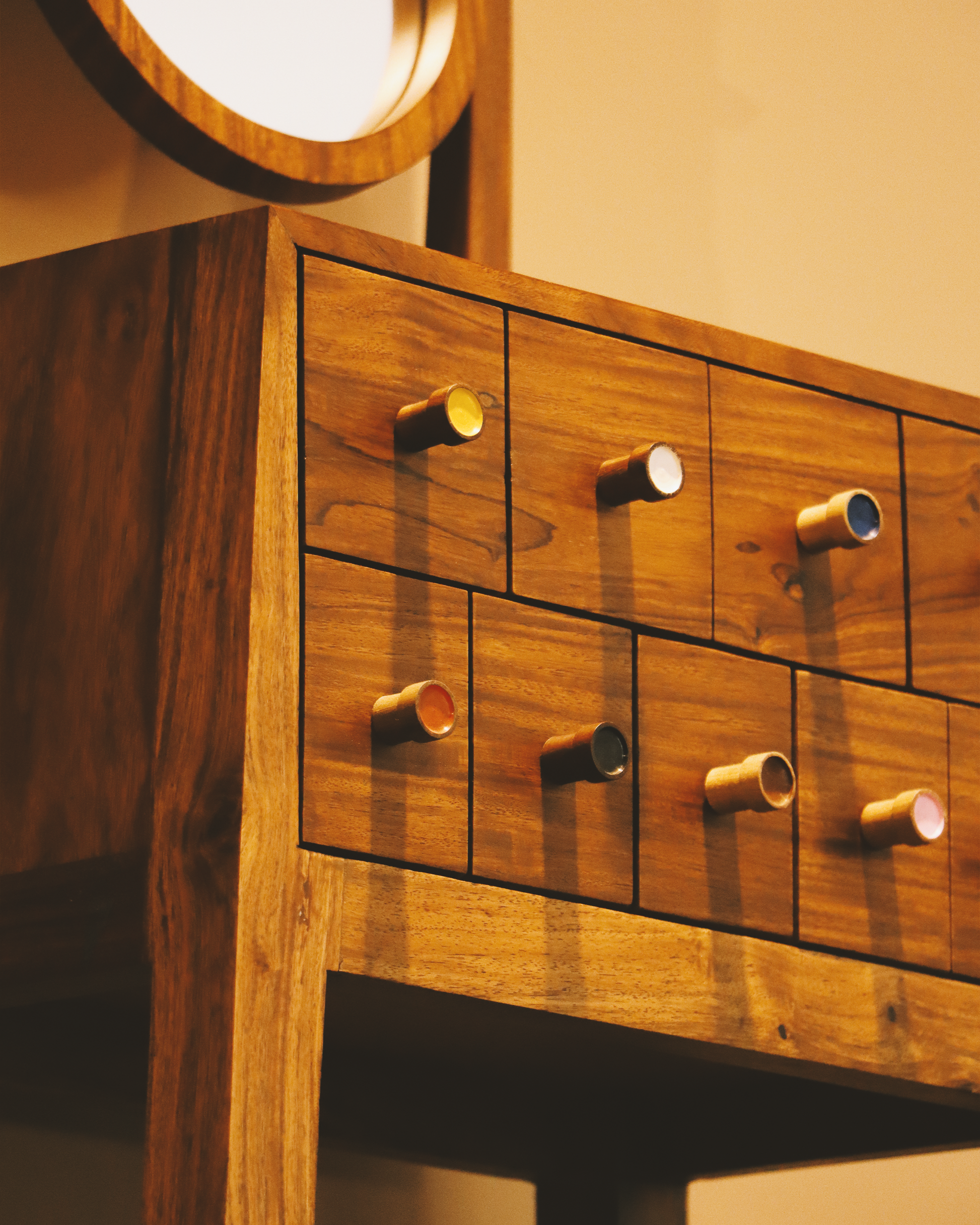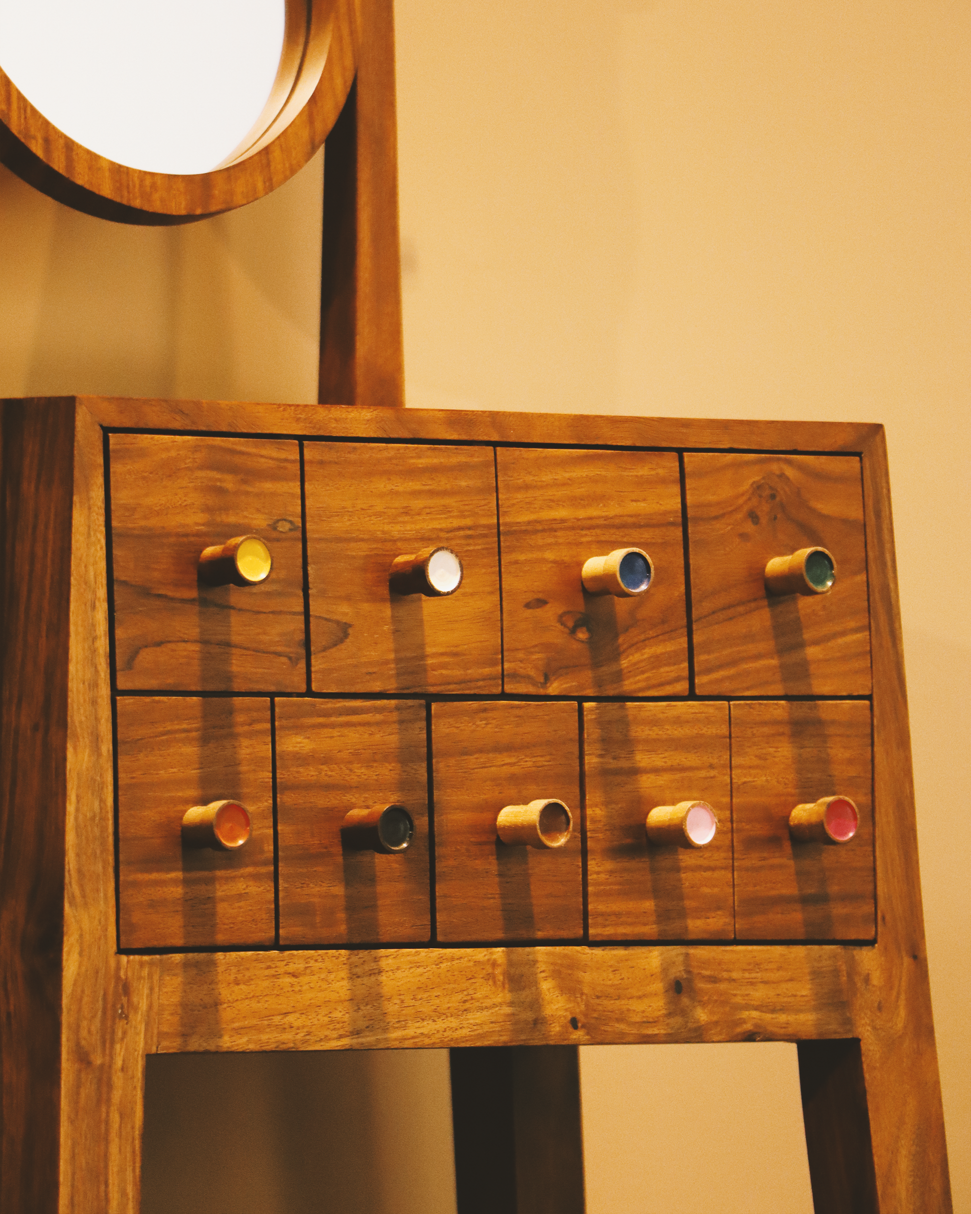 Add a splash of playful charm to your space with this handcrafted wooden dresser, featuring a sleek oval mirror and 10 mini drawers with multicolored knobs. The mid-century modern design is elevated by its natural wood finish and vibrant drawer handles, making it both a functional storage unit and a bold decorative piece. Perfect for bedrooms, dressing areas, or creative workspaces, this dresser is a blend of utility and artistic flair.