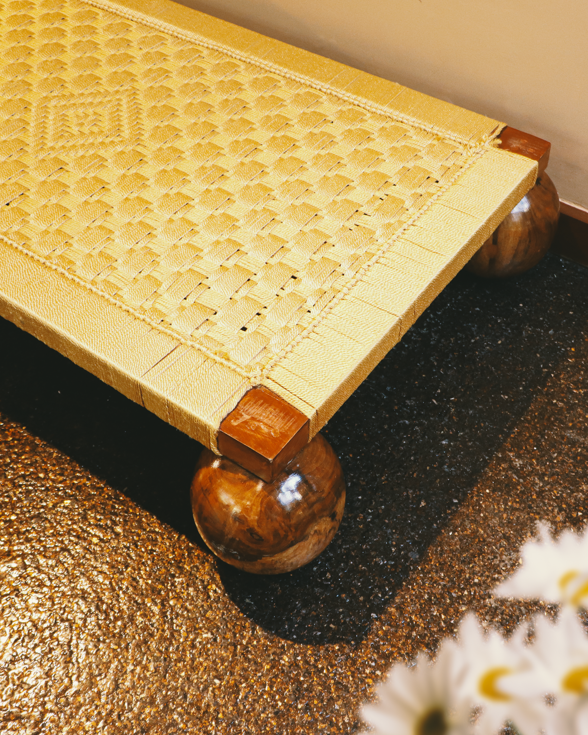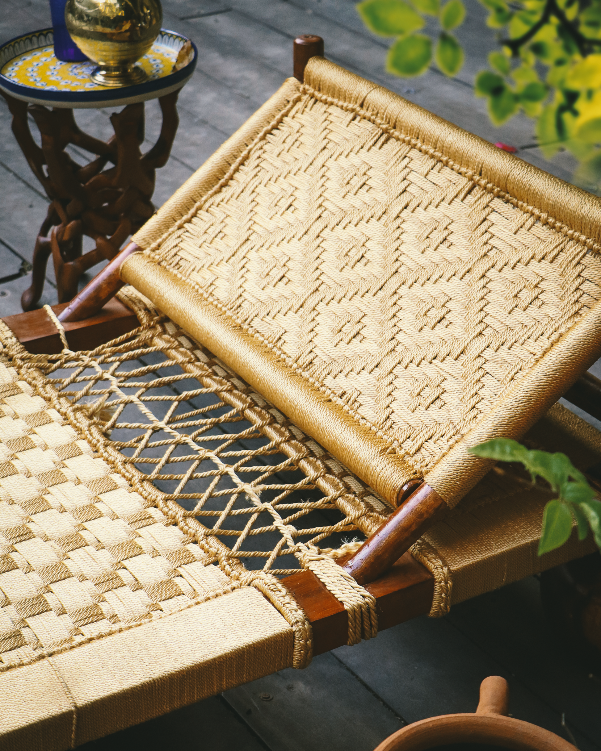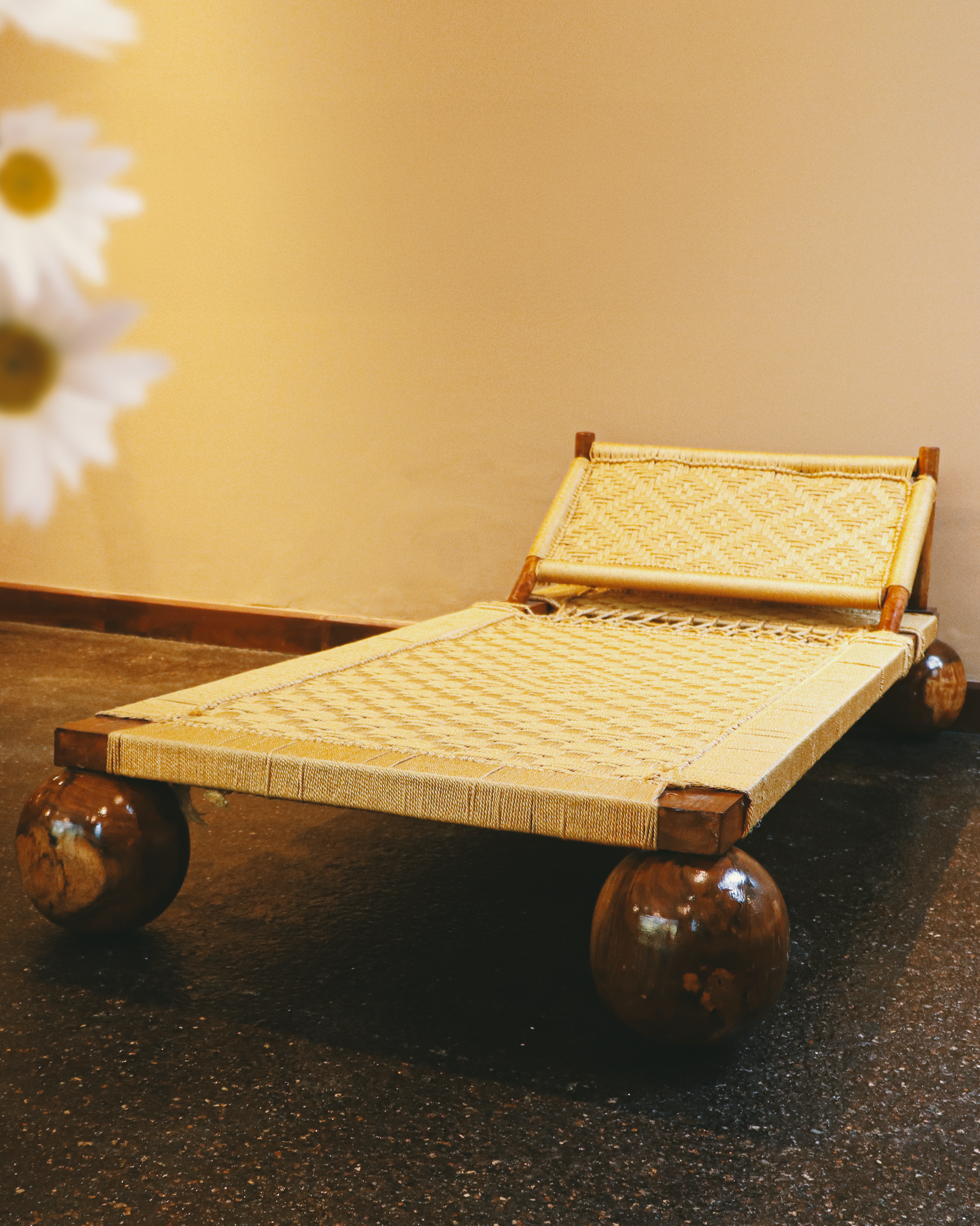 Elevate your living space with this handcrafted manji, a traditional Indian woven cot featuring intricate natural fiber weaving and robust wooden spherical legs. Designed for durability and comfort, its slanted backrest makes it perfect for lounging, napping, or simply relaxing in style. Whether placed indoors or outdoors, this artisanal piece adds cultural charm and earthy elegance to any décor.